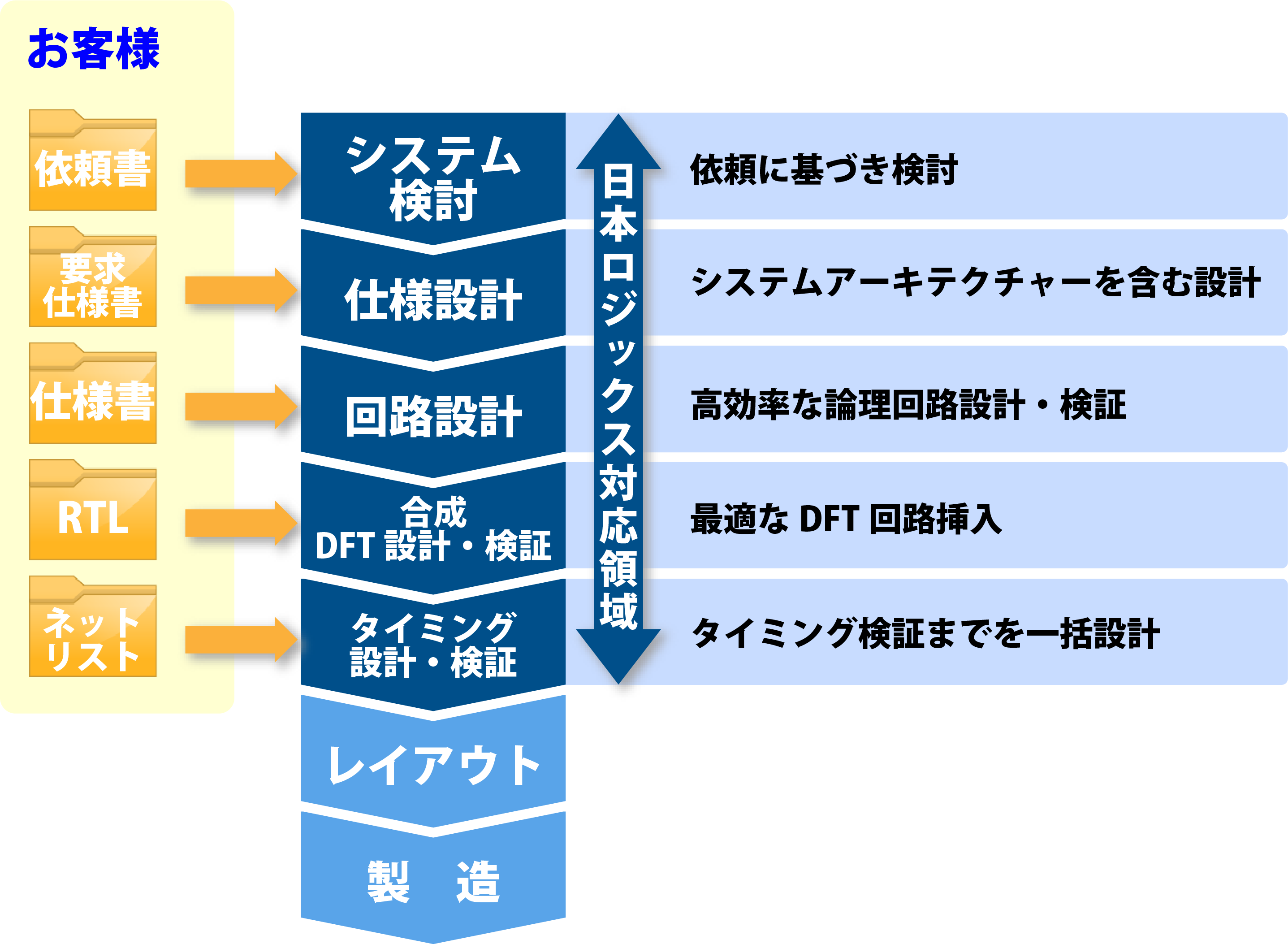 システム検討からタイミング設計・検証まで、一貫して対応します。また、お客様のご要望により個別工程での開発も行います。